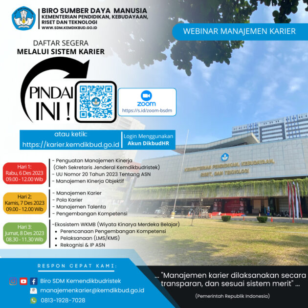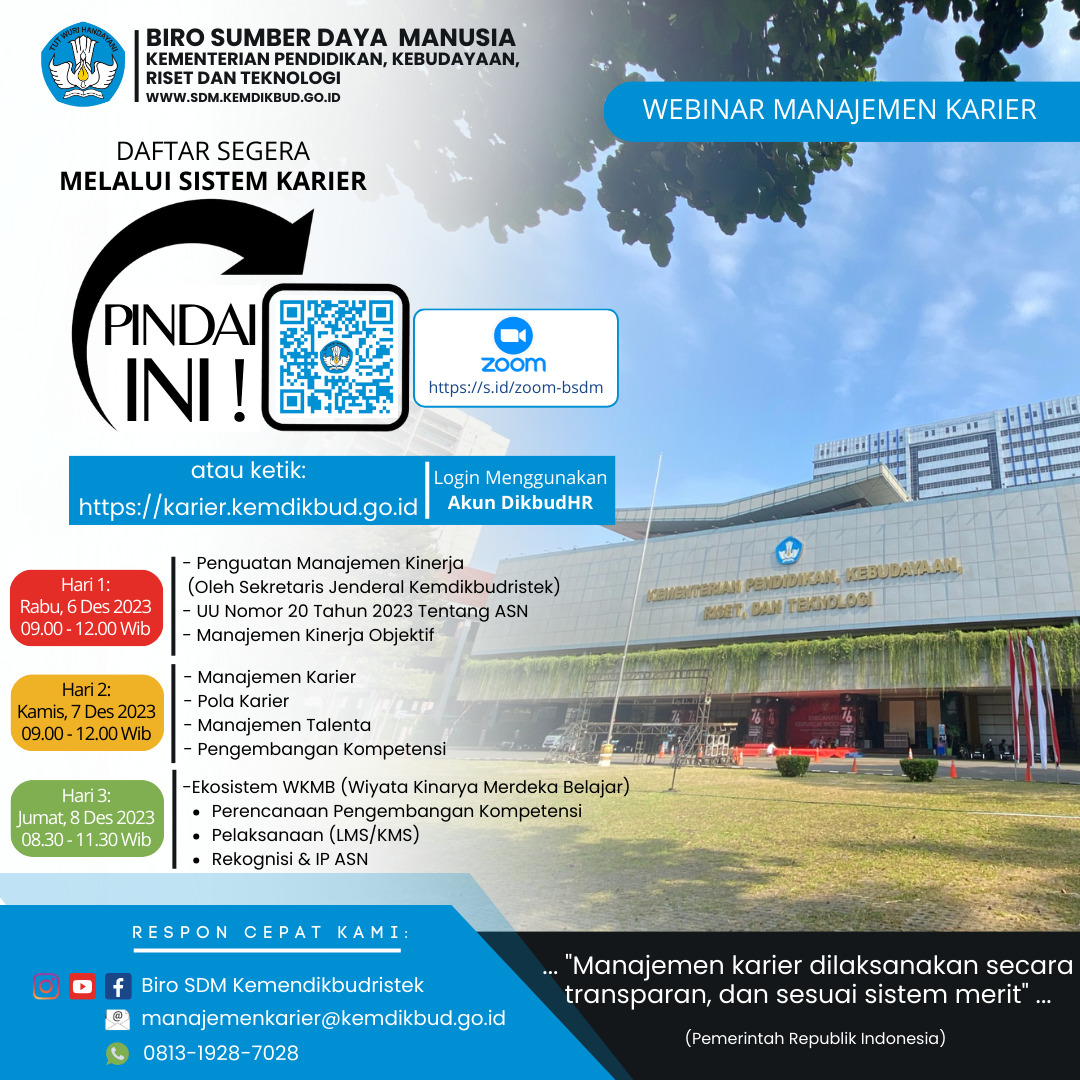 Menindaklanjuti surat Plh. Sekretaris Jenderal Kementerian Pendidikan, Kebudayaan, Riset, dan Teknologi Nomor : 41742/A.A3/PP.01.06/2023 tanggal 30 November 2023 tentang Webinar Manajemen Karier dan Pengembangan Pegawai, untuk menyosialisasikan dan meningkatkan pengetahuan seluruh pegawai terhadap kebijakan dan sistem informasi terintegrasi yang akan digunakan dalam pengembangan karier, pengembangan kompetensi, pola karier, promosi dan mutasi, maka kami mengundang Bapak/Ibu pada kegiatan webinar yang akan dilaksanakan secara daring pada :